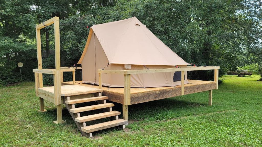 A 13ft Bell Tent right on Coker Creek. Perfect for convenient Gold Panning. It is off the ground on a platform in our Primitive tent camping area right next to the creek. It is unfurnished so you can bring all your own gear. It does not have power…… Yet.